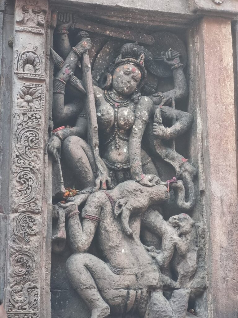 Then Durga created the Matrikas. Each Matrika came from a major deity, Brahmani (Brahma), Vaishnavi (Vishnu), Maheshwari (Mahesh/Shiv), Indrani(Indra), Kaumari (Kartikeya), Varahi (Varaha), Chamunda, Narasimhi (Narashimha) and Vinayaki (Vinayaka). Among them, Maa Chamunda was different. She was not the shakti of a male god. She was Devi’s own fierce power. She spread her long tongue across the battlefield. Every drop of blood fell on it. Nothing touched the ground. She swallowed every clone of Raktabīja and ended him.